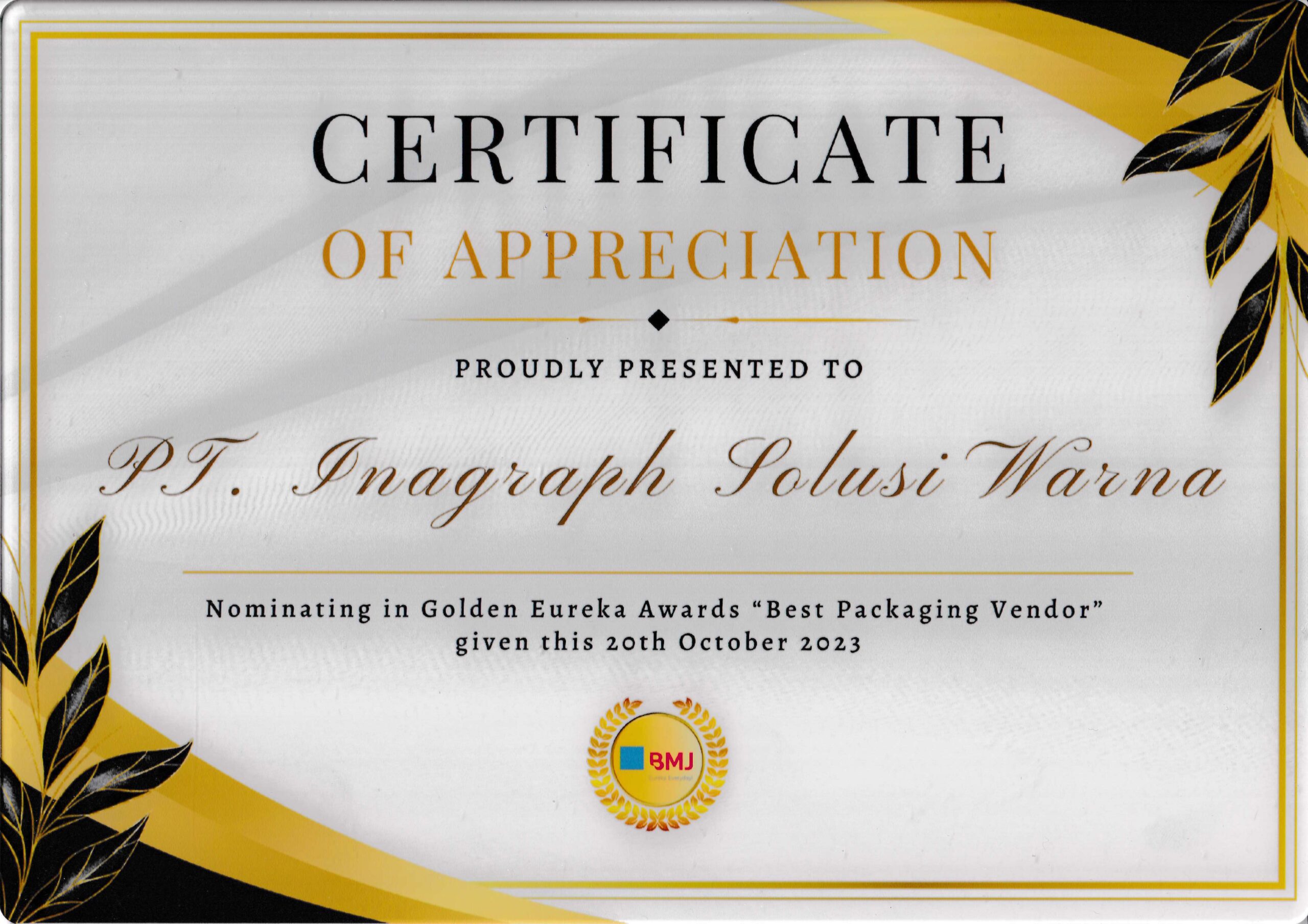 Piagam penghargaan dari BMJ sebagai “Best Packaging Vendor.”